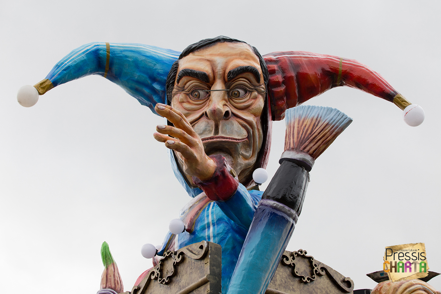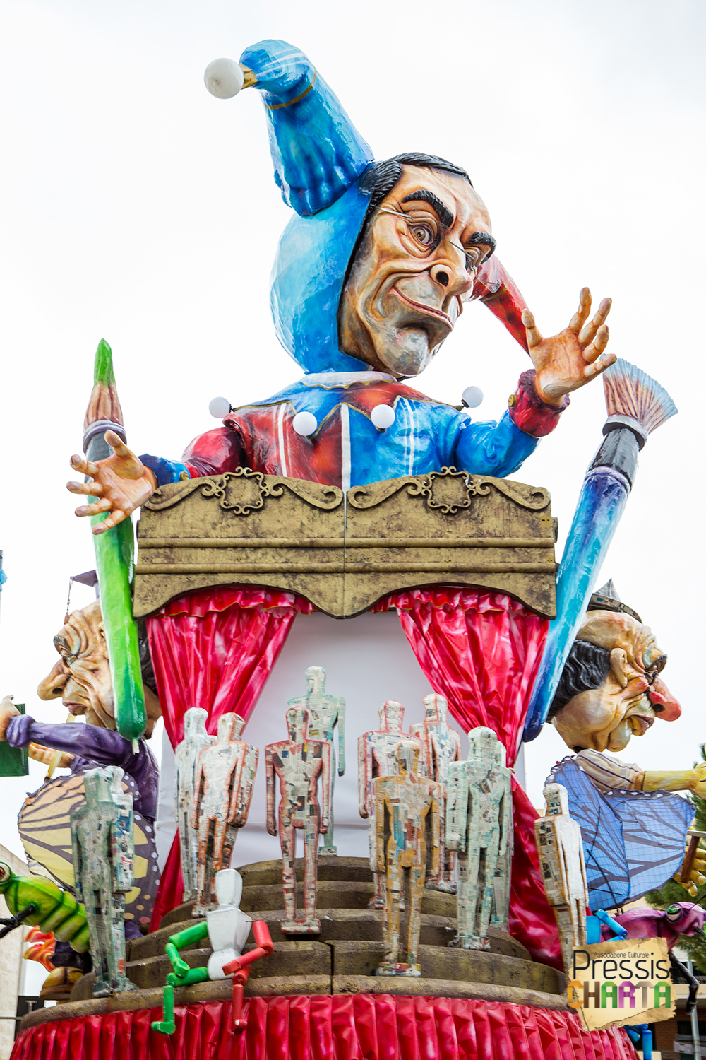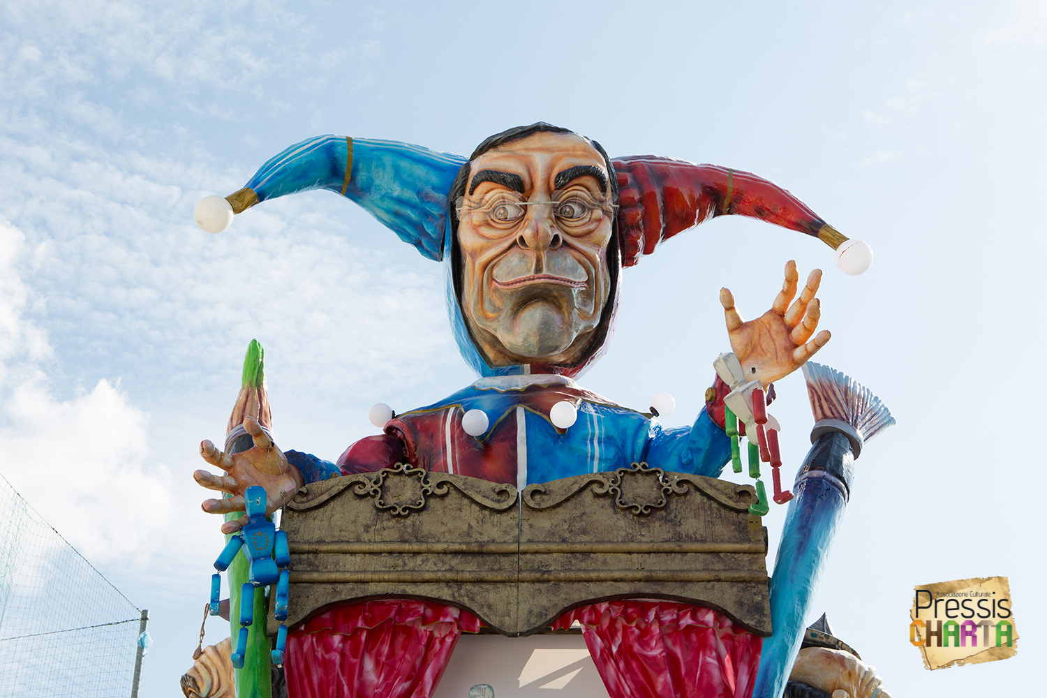 Predomina sul carro, un imponente Jolly con il volto del presidente della BCE, Mario Draghi, che gioca con le sue marionette: Europa e Italia, inermi e alla mercé delle sue volontà, che a sua volta è illusionista e giullare di corte delle super potenze mondiali.