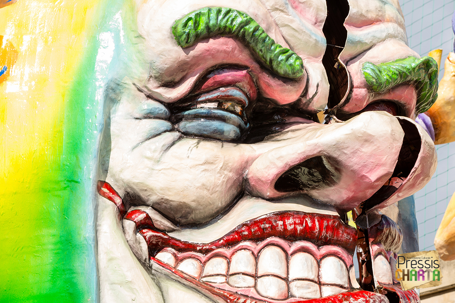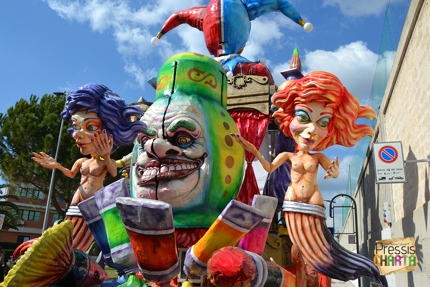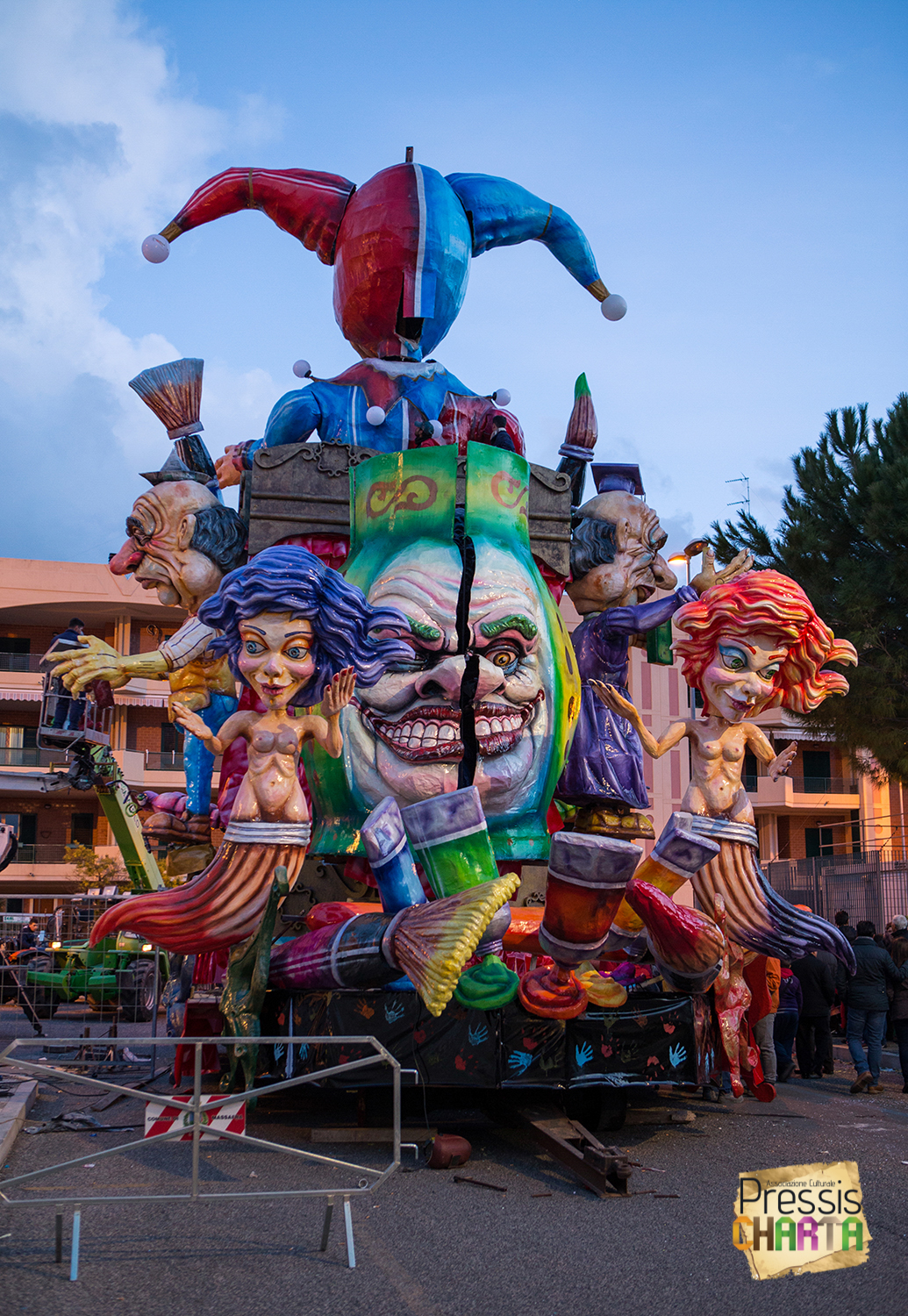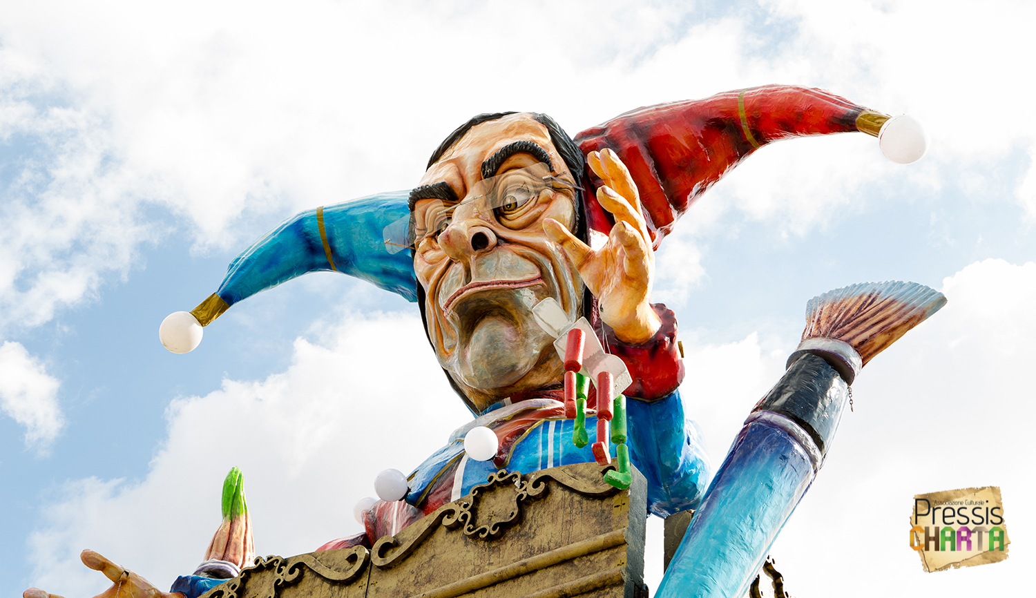 Predomina sul carro, un imponente Jolly con il volto del presidente della BCE, Mario Draghi, che gioca con le sue marionette: Europa e Italia, inermi e alla mercé delle sue volontà, che a sua volta è illusionista e giullare di corte delle super potenze mondiali.