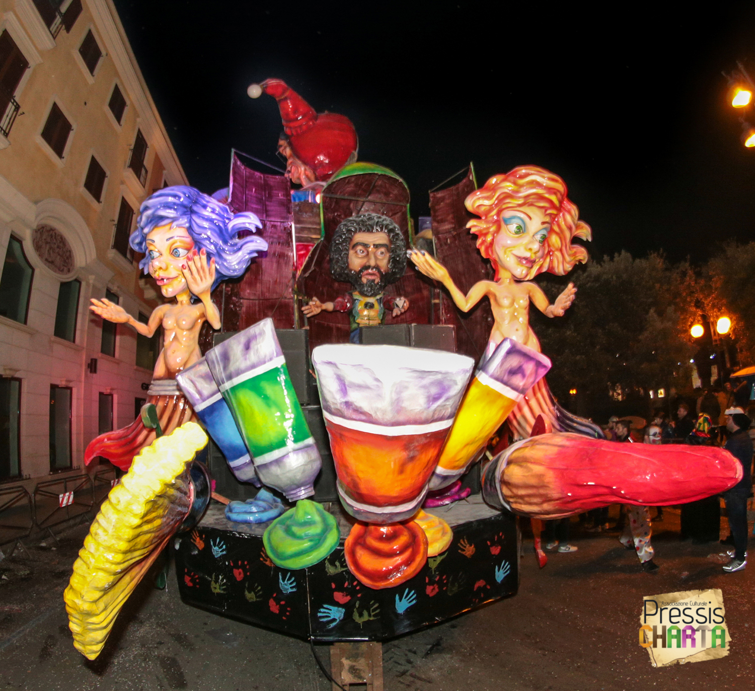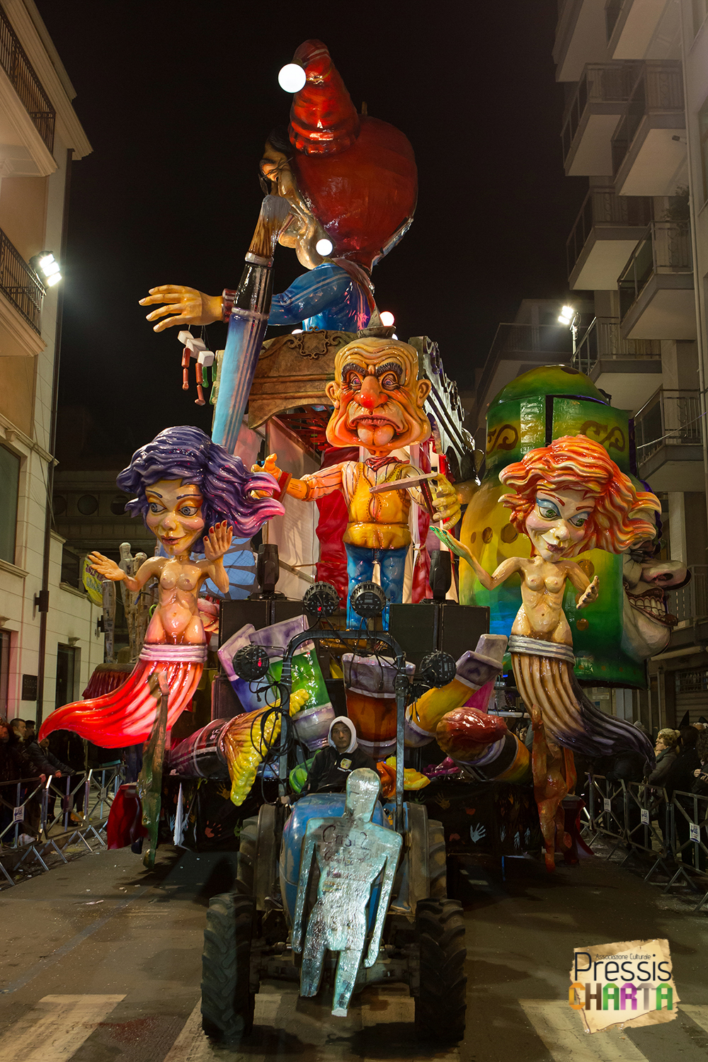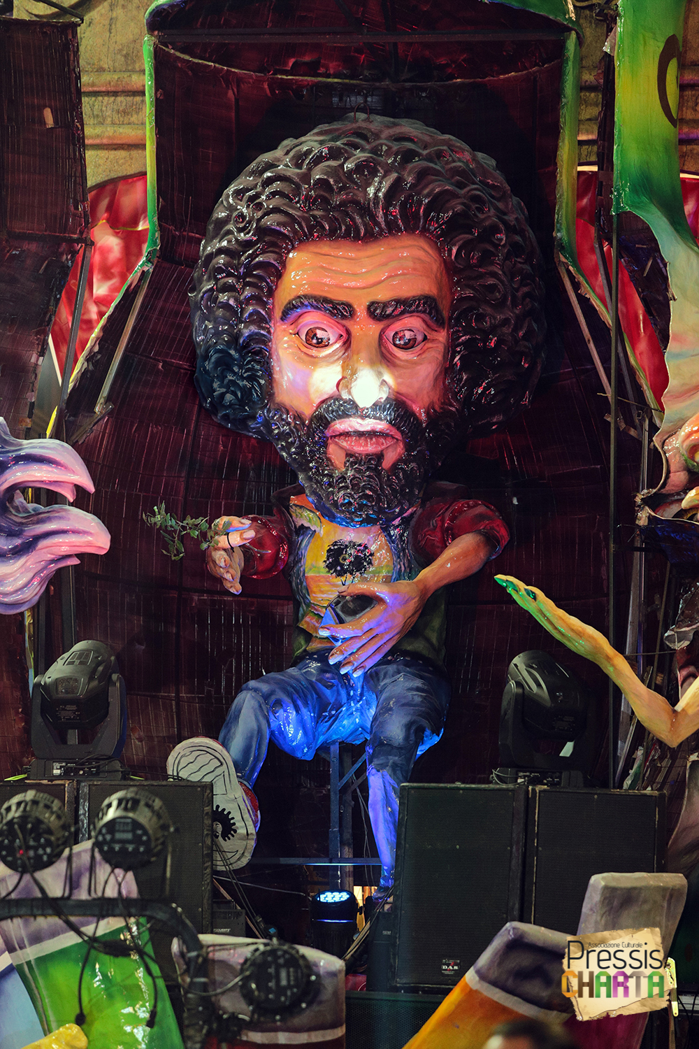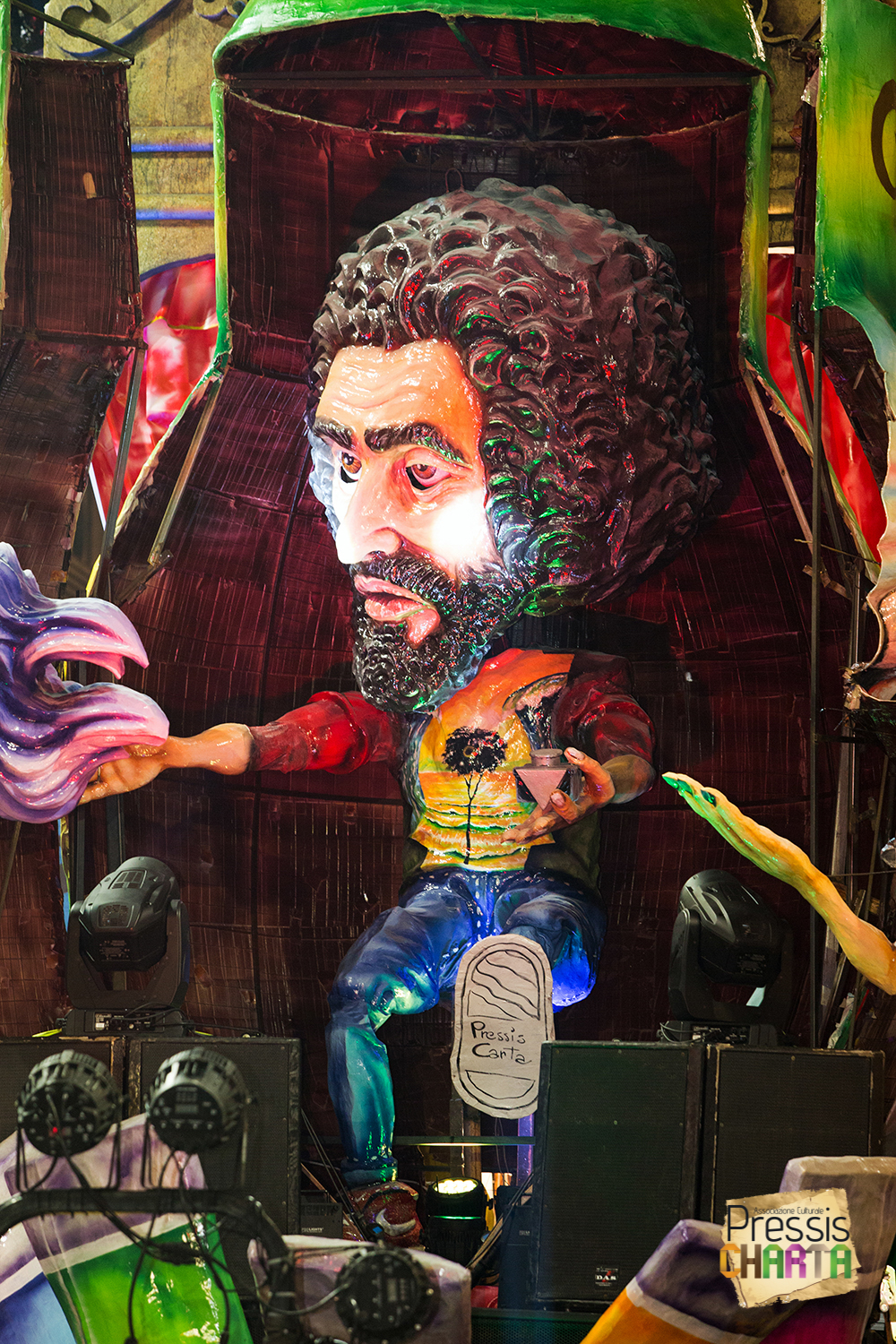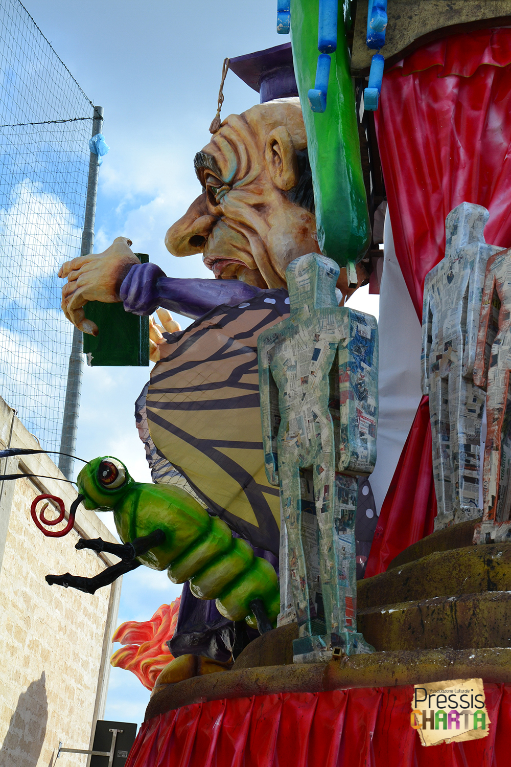 Osservando il carro dal basso verso l’alto vediamo in progressione, un’imponente matrioska che al suo interno contiene il rapper CapaRezza (riproducendo la scenografia attuata durante i concerti dell’album “Museica”) intento a intingere il suo ramoscello d’ulivo all’interno di un calamaio, con riferimento alle canzoni “Vieni a ballare in Puglia” (il ramoscello d’ulivo) e “China town” (il calamaio).