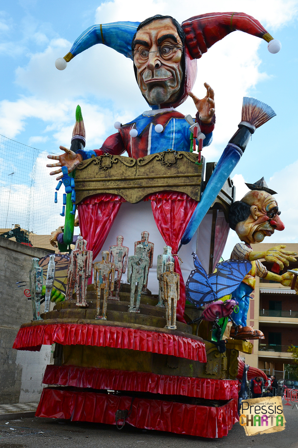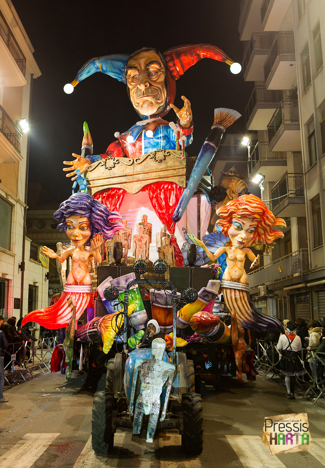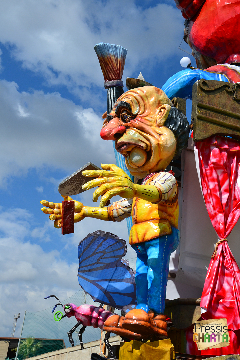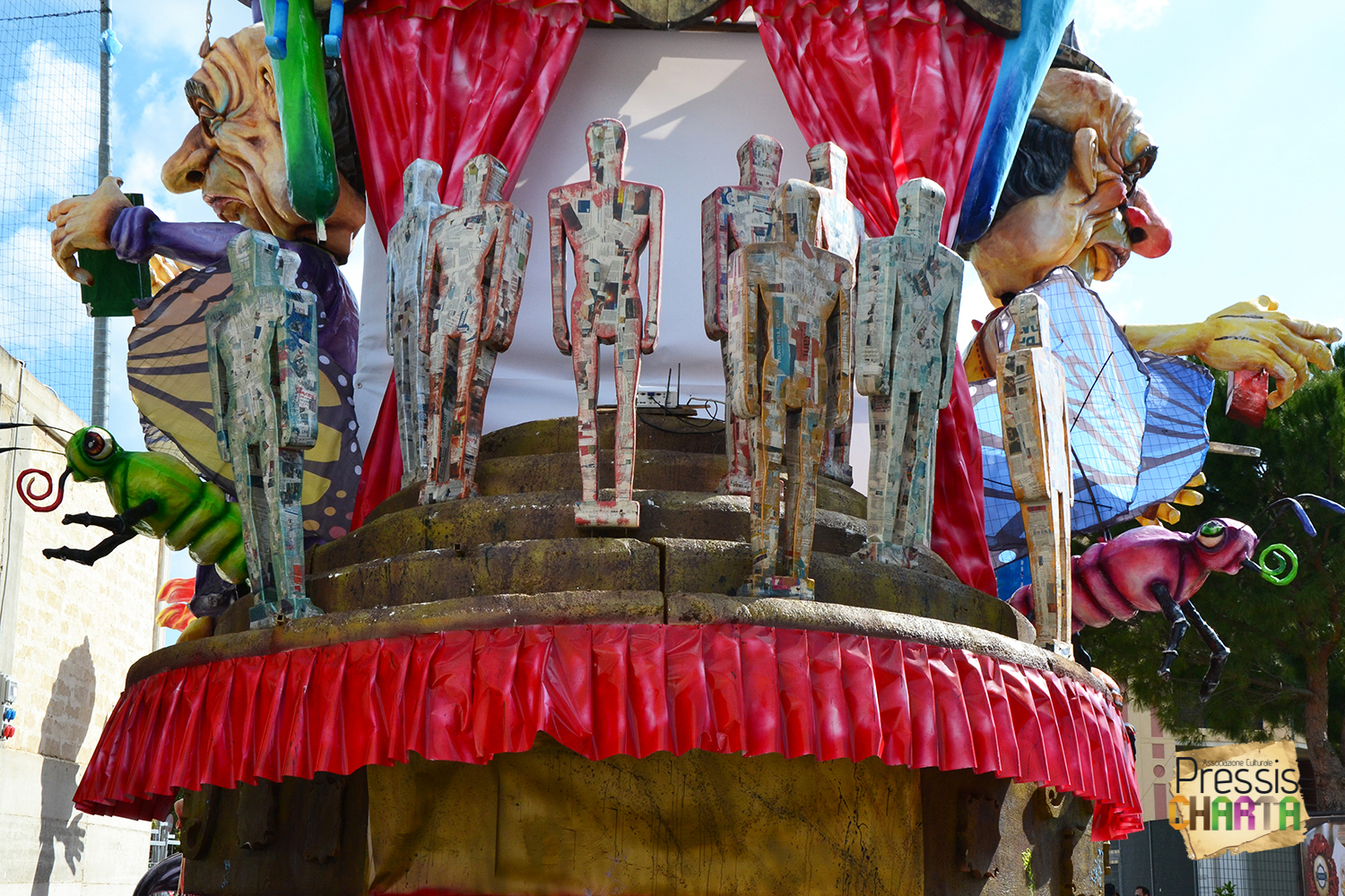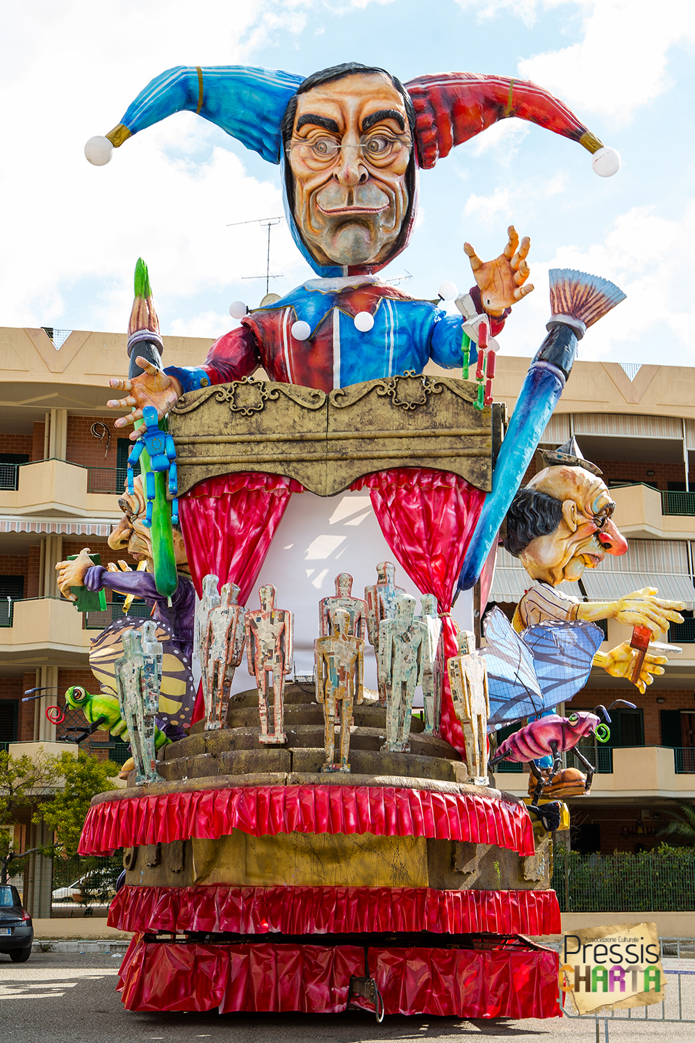 Osservando il carro dal basso verso l’alto vediamo in progressione, un’imponente matrioska che al suo interno contiene il rapper CapaRezza (riproducendo la scenografia attuata durante i concerti dell’album “Museica”) intento a intingere il suo ramoscello d’ulivo all’interno di un calamaio, con riferimento alle canzoni “Vieni a ballare in Puglia” (il ramoscello d’ulivo) e “China town” (il calamaio).