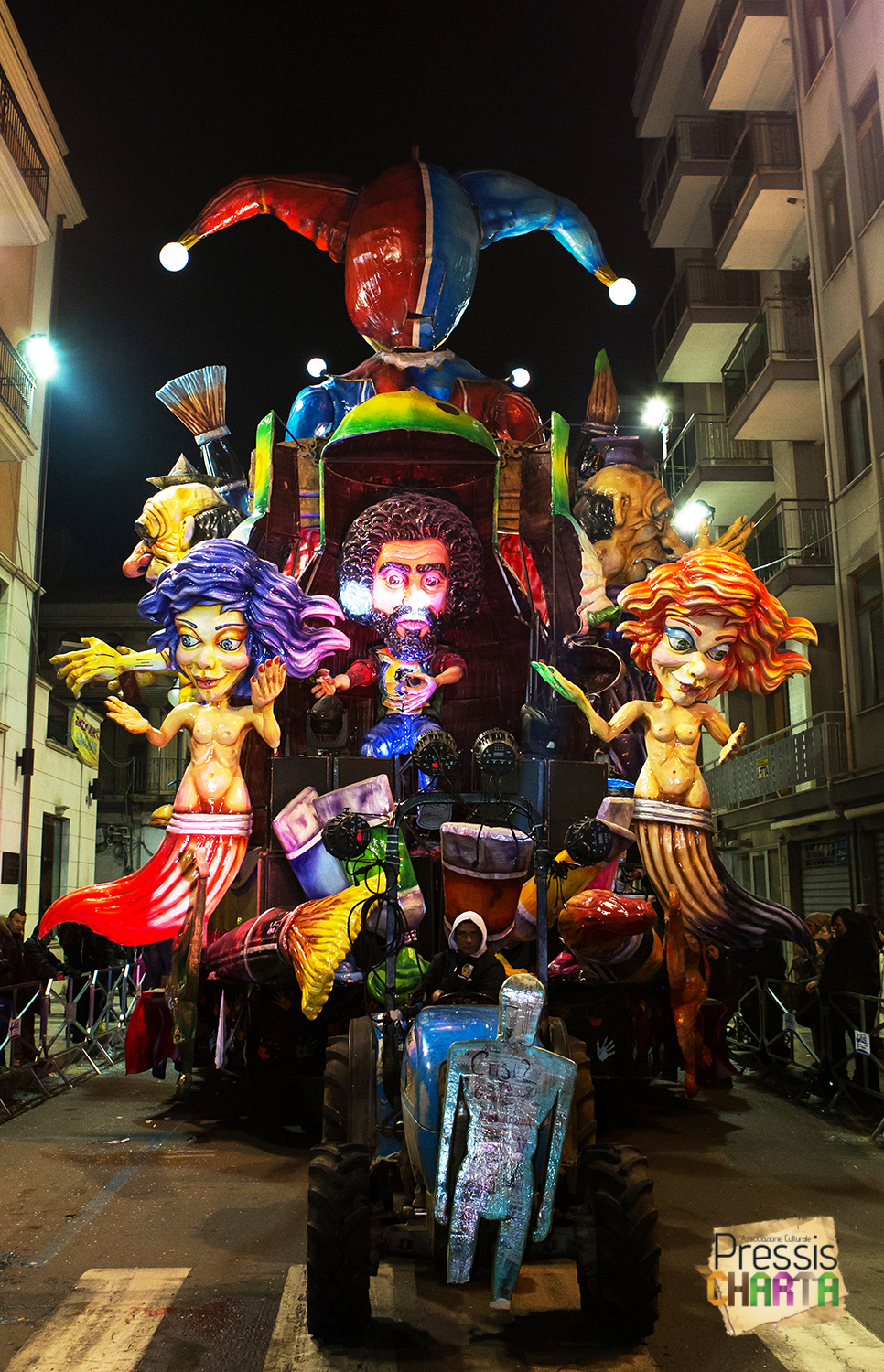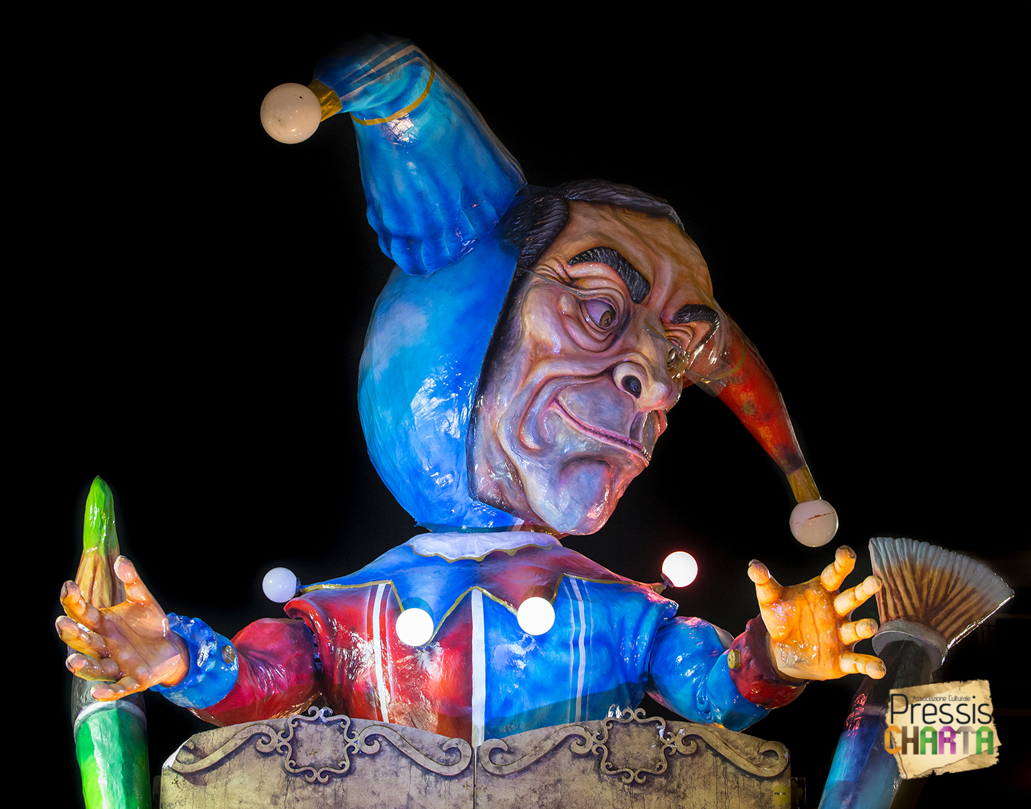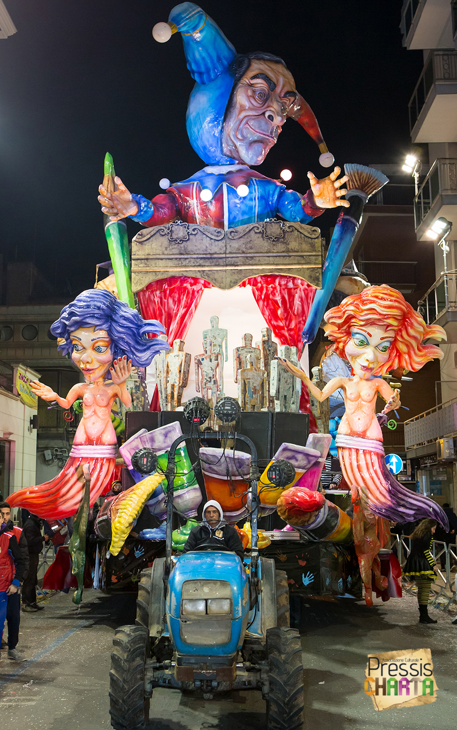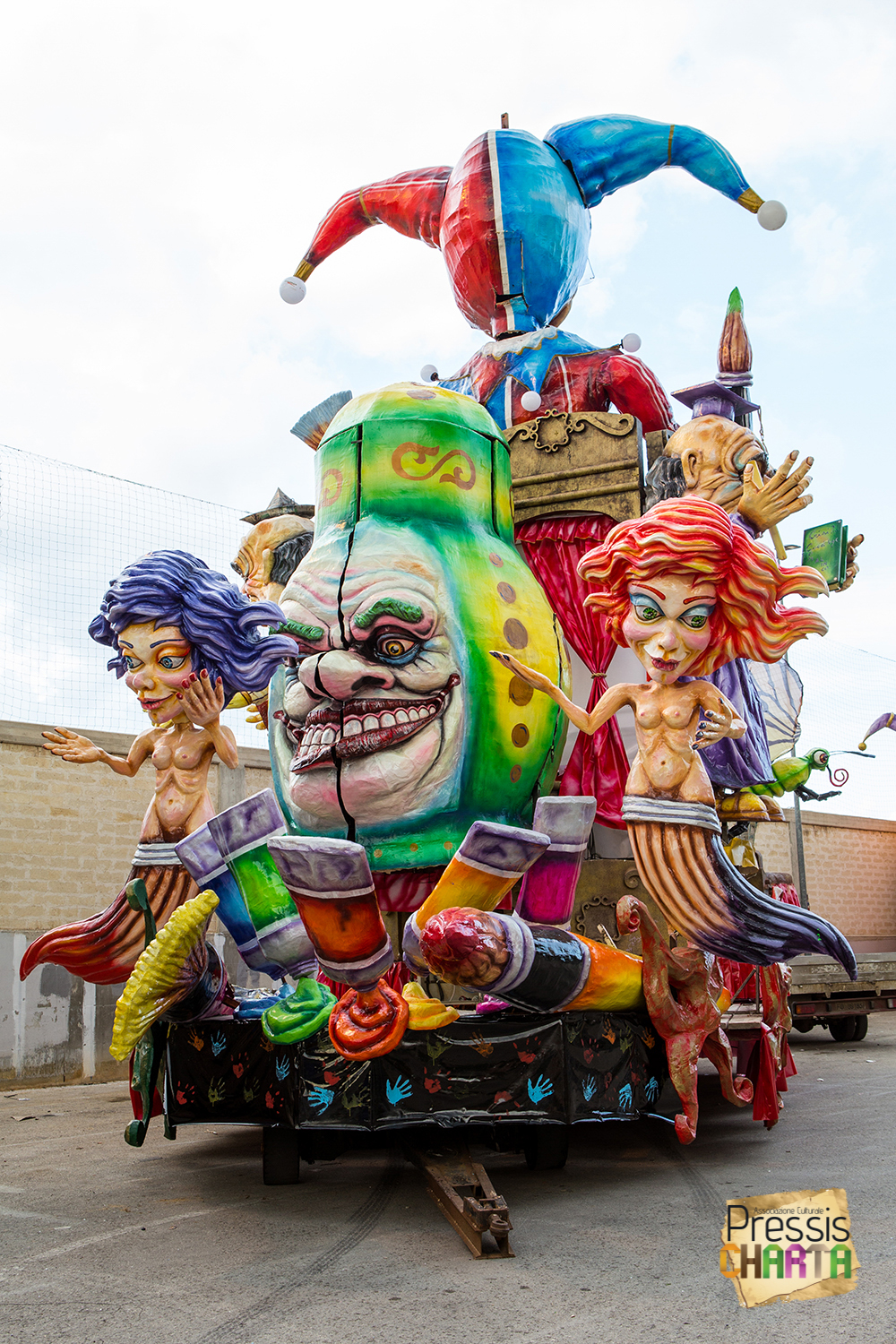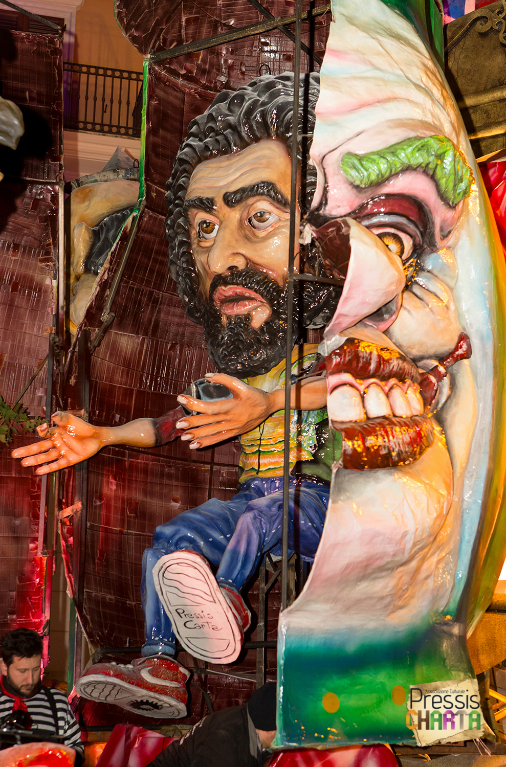 Osservando il carro dal basso verso l’alto vediamo in progressione, un’imponente matrioska che al suo interno contiene il rapper CapaRezza (riproducendo la scenografia attuata durante i concerti dell’album “Museica”) intento a intingere il suo ramoscello d’ulivo all’interno di un calamaio, con riferimento alle canzoni “Vieni a ballare in Puglia” (il ramoscello d’ulivo) e “China town” (il calamaio).