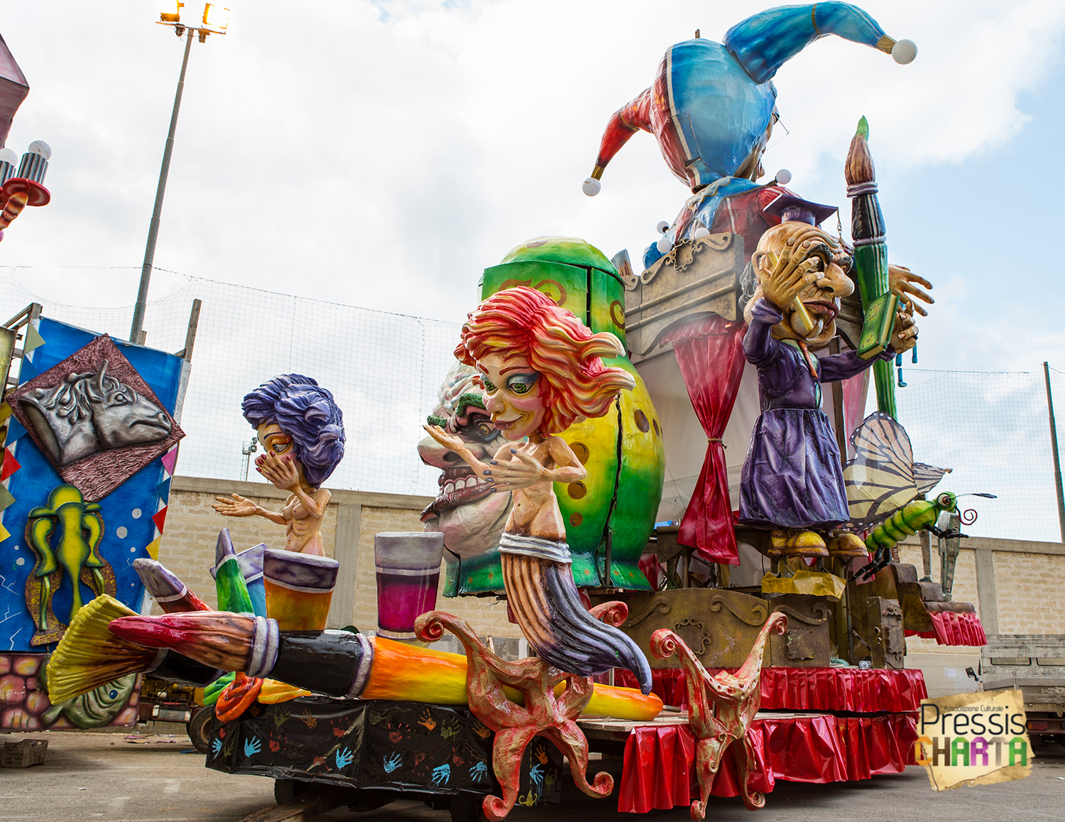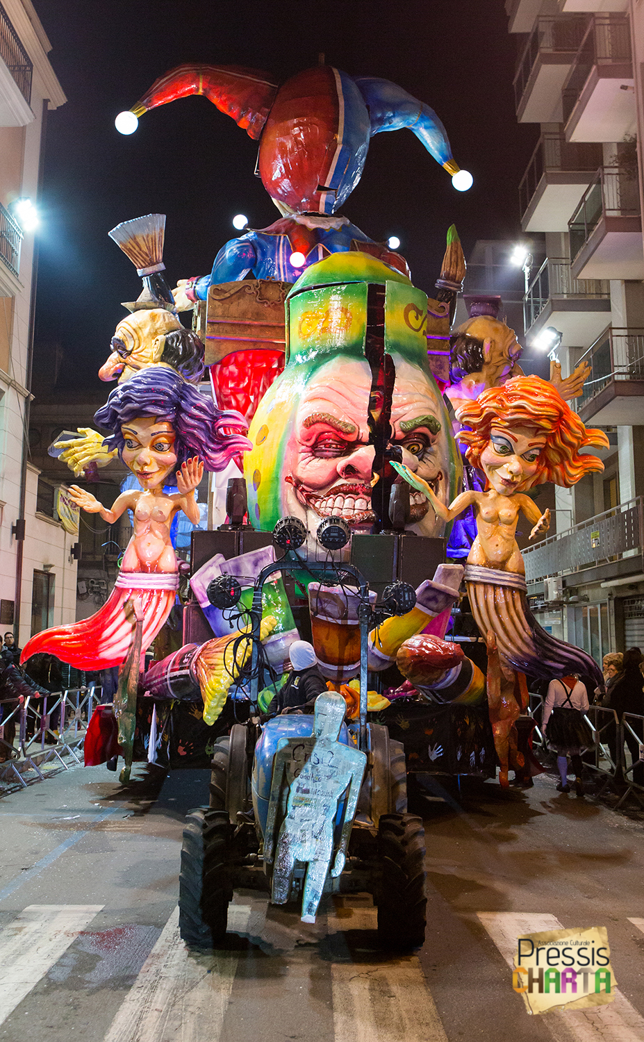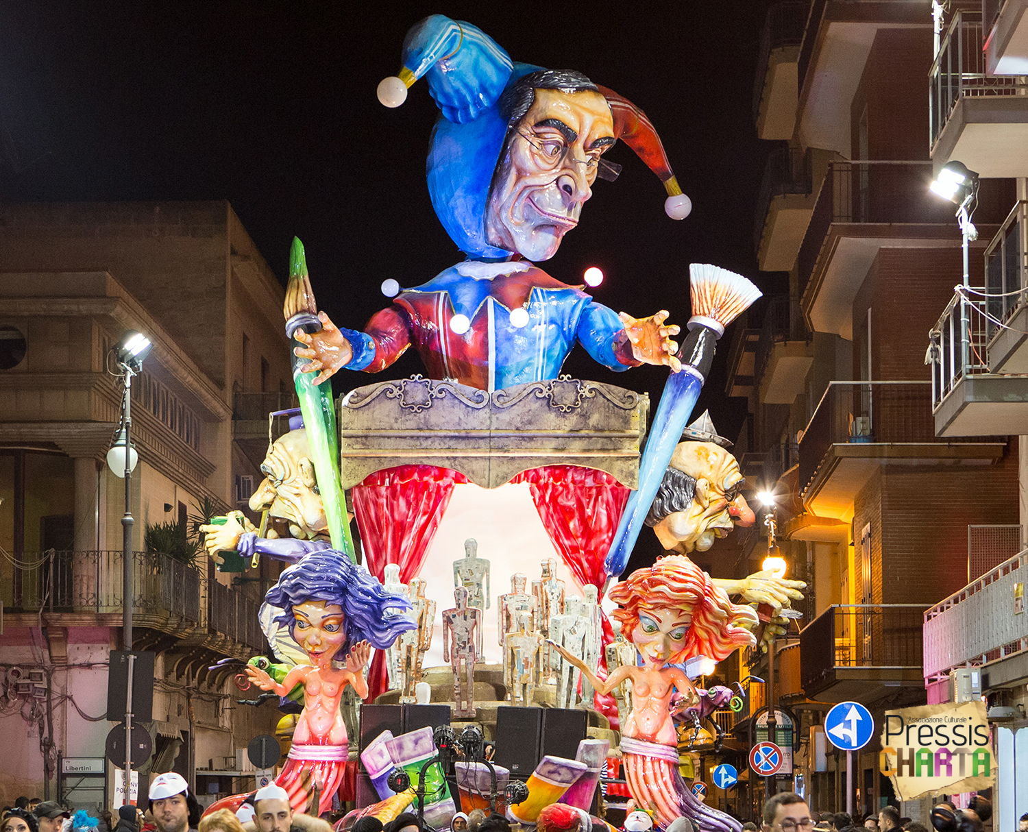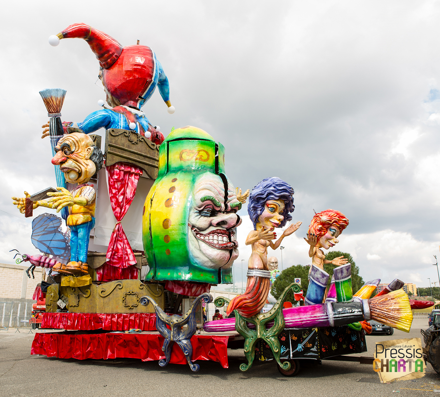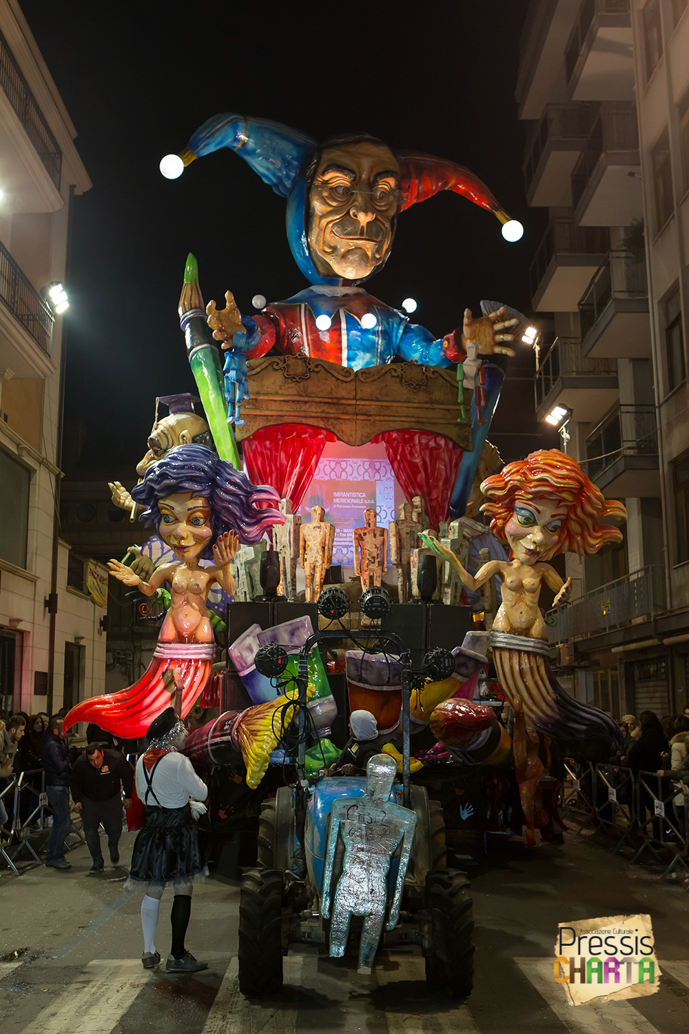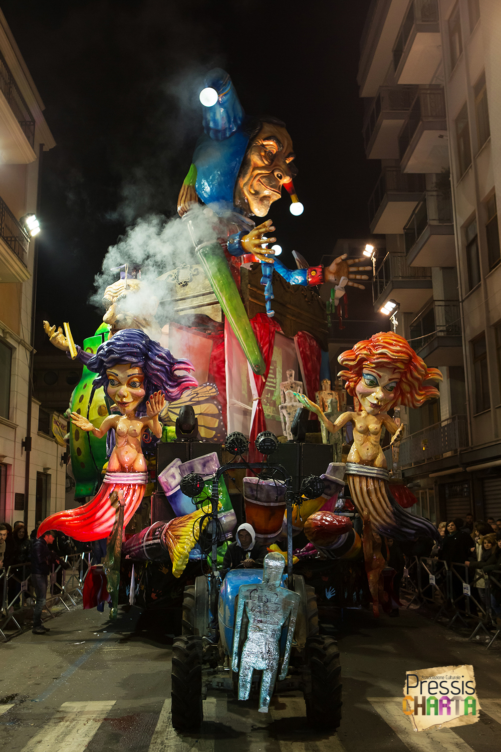 Osservando il carro dal basso verso l’alto vediamo in progressione, un’imponente matrioska che al suo interno contiene il rapper CapaRezza (riproducendo la scenografia attuata durante i concerti dell’album “Museica”) intento a intingere il suo ramoscello d’ulivo all’interno di un calamaio, con riferimento alle canzoni “Vieni a ballare in Puglia” (il ramoscello d’ulivo) e “China town” (il calamaio).