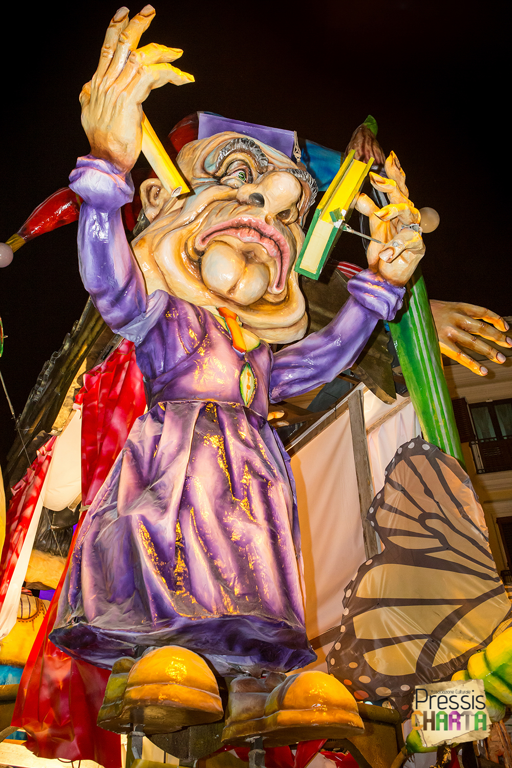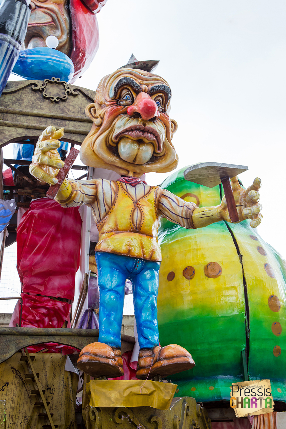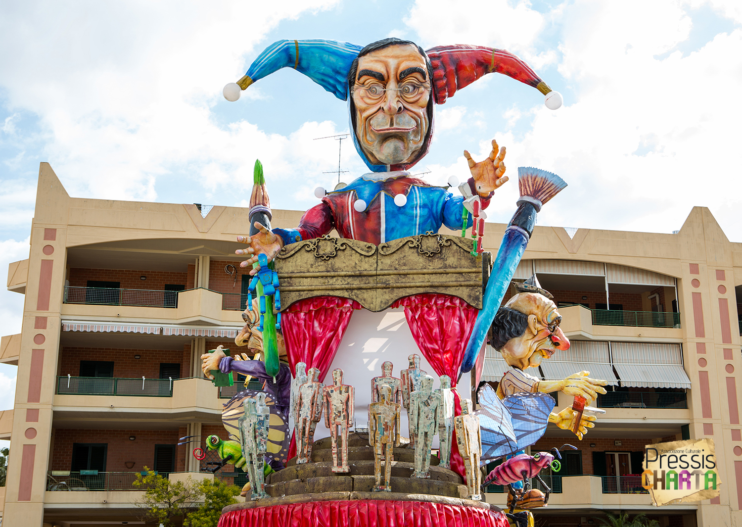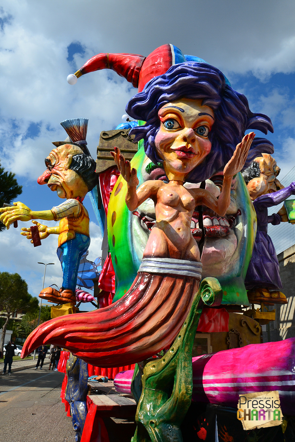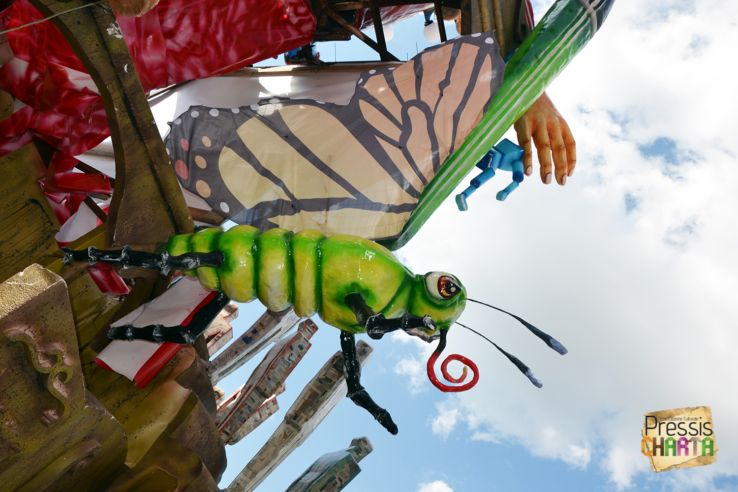 Osservando il carro dal basso verso l’alto vediamo in progressione, un’imponente matrioska che al suo interno contiene il rapper CapaRezza (riproducendo la scenografia attuata durante i concerti dell’album “Museica”) intento a intingere il suo ramoscello d’ulivo all’interno di un calamaio, con riferimento alle canzoni “Vieni a ballare in Puglia” (il ramoscello d’ulivo) e “China town” (il calamaio).
