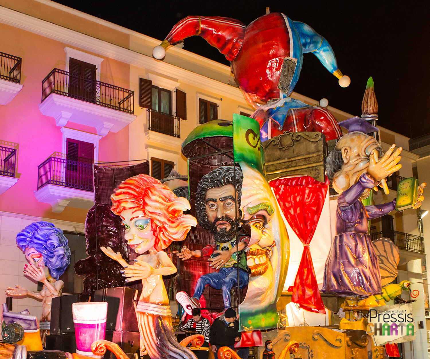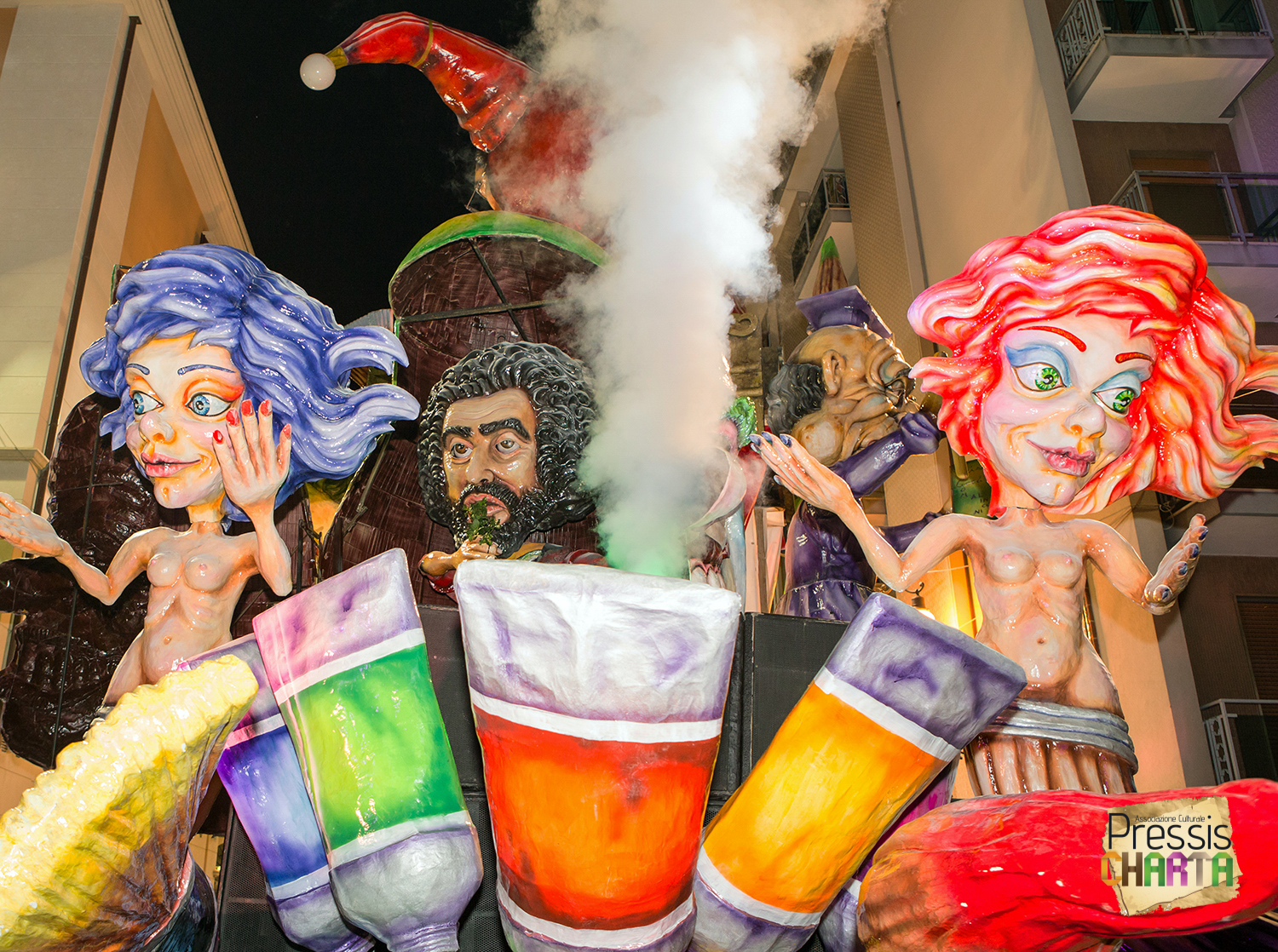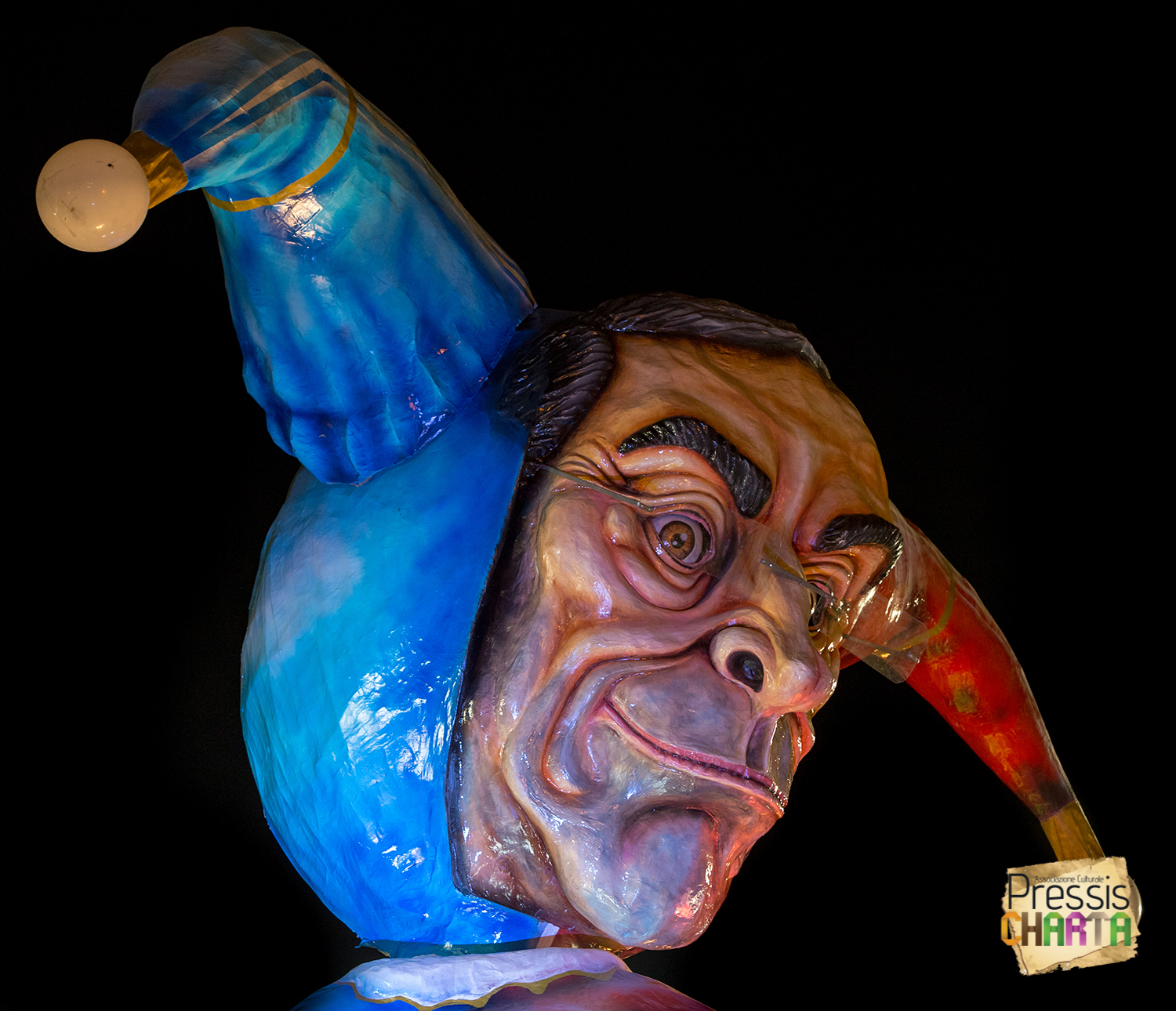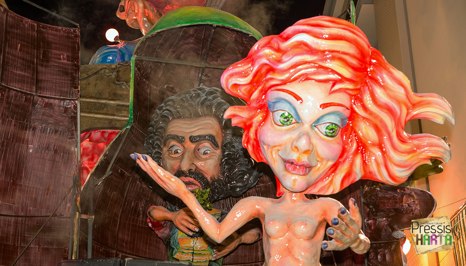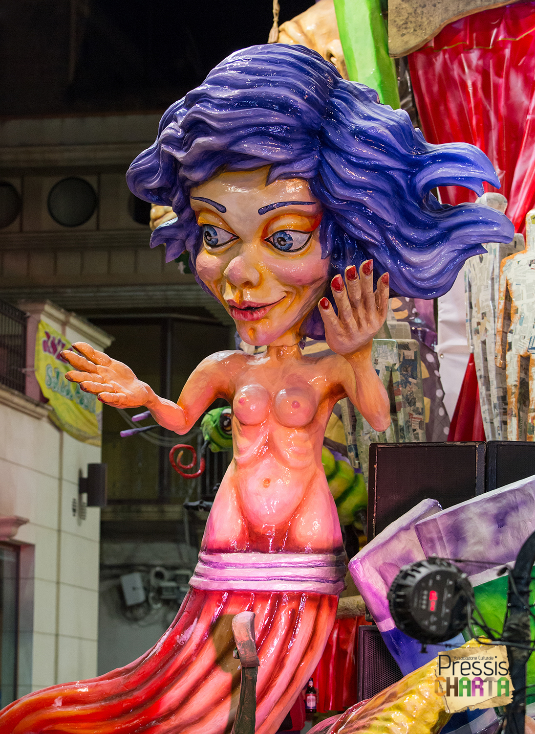 Osservando il carro dal basso verso l’alto vediamo in progressione, un’imponente matrioska che al suo interno contiene il rapper CapaRezza (riproducendo la scenografia attuata durante i concerti dell’album “Museica”) intento a intingere il suo ramoscello d’ulivo all’interno di un calamaio, con riferimento alle canzoni “Vieni a ballare in Puglia” (il ramoscello d’ulivo) e “China town” (il calamaio).