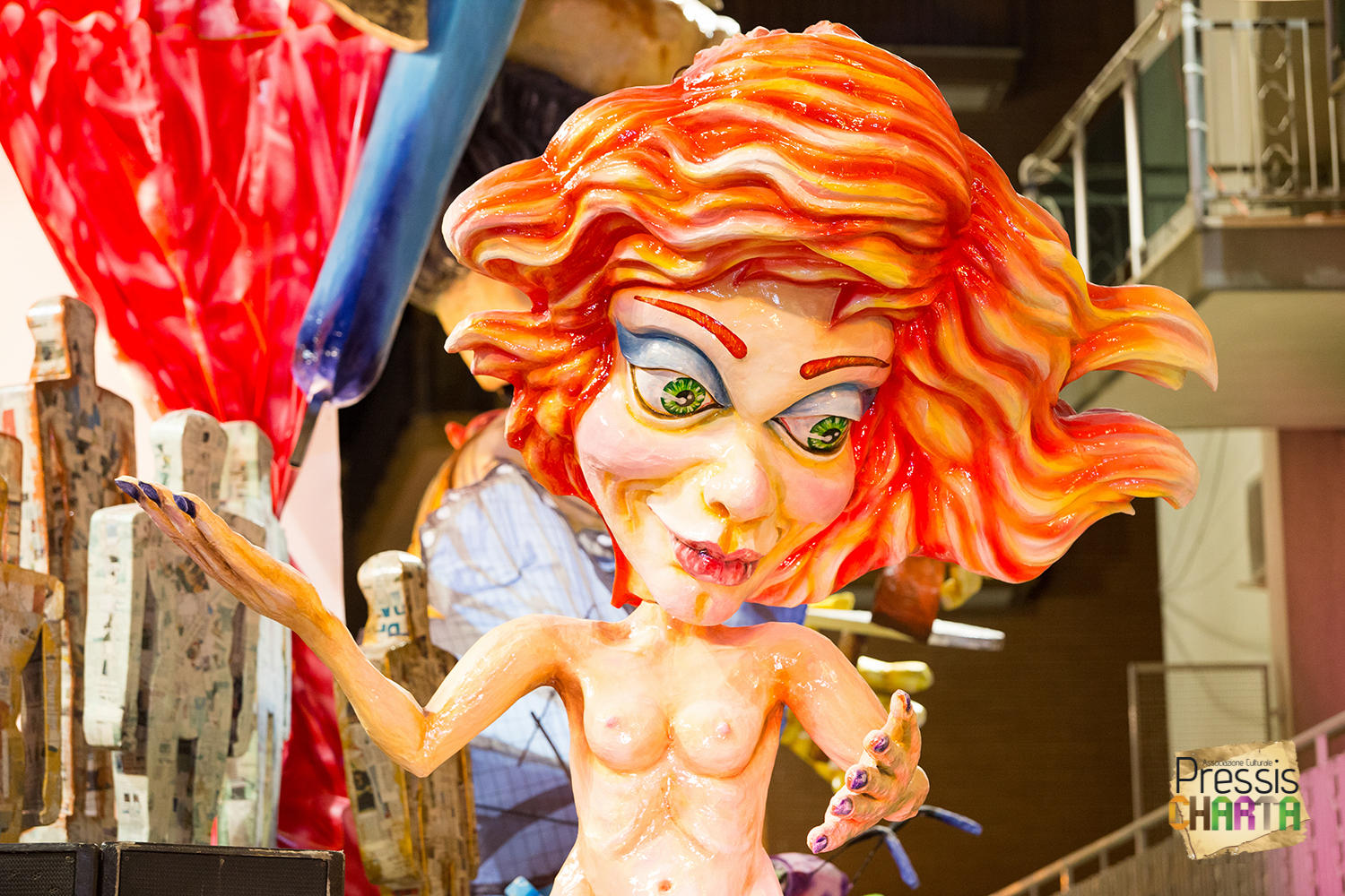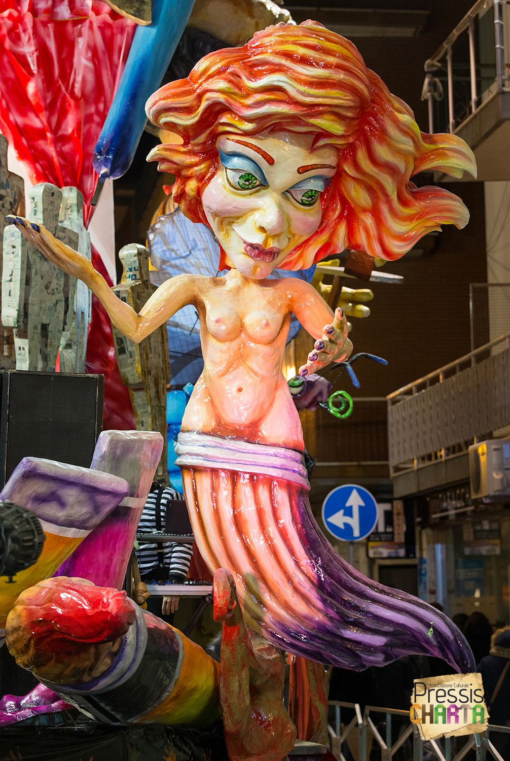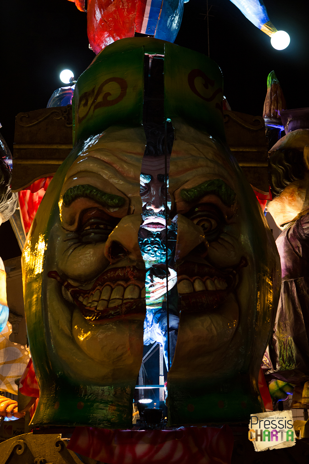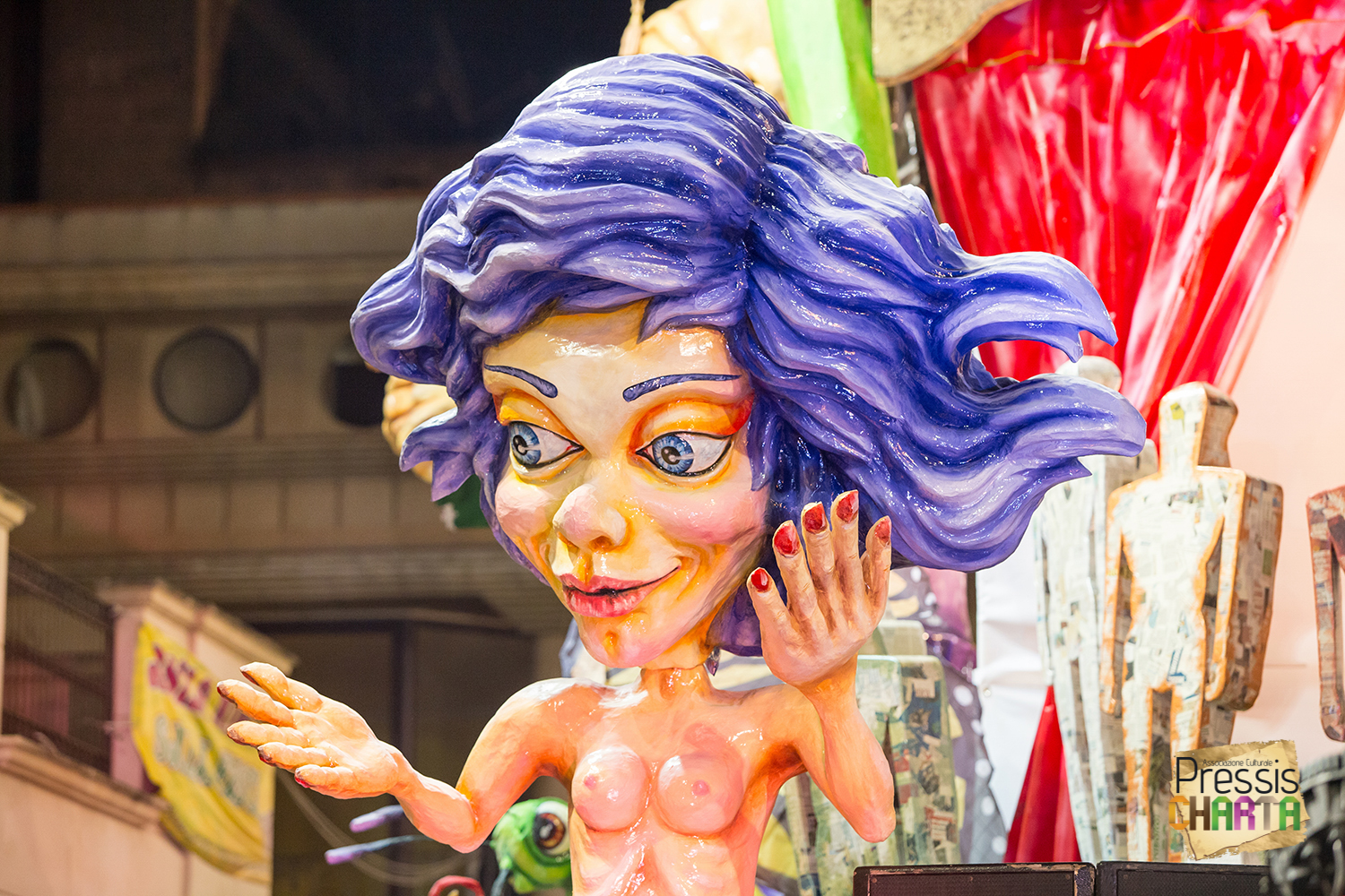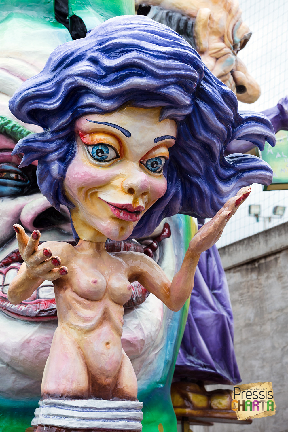 Osservando il carro dal basso verso l’alto vediamo in progressione, un’imponente matrioska che al suo interno contiene il rapper CapaRezza (riproducendo la scenografia attuata durante i concerti dell’album “Museica”) intento a intingere il suo ramoscello d’ulivo all’interno di un calamaio, con riferimento alle canzoni “Vieni a ballare in Puglia” (il ramoscello d’ulivo) e “China town” (il calamaio).