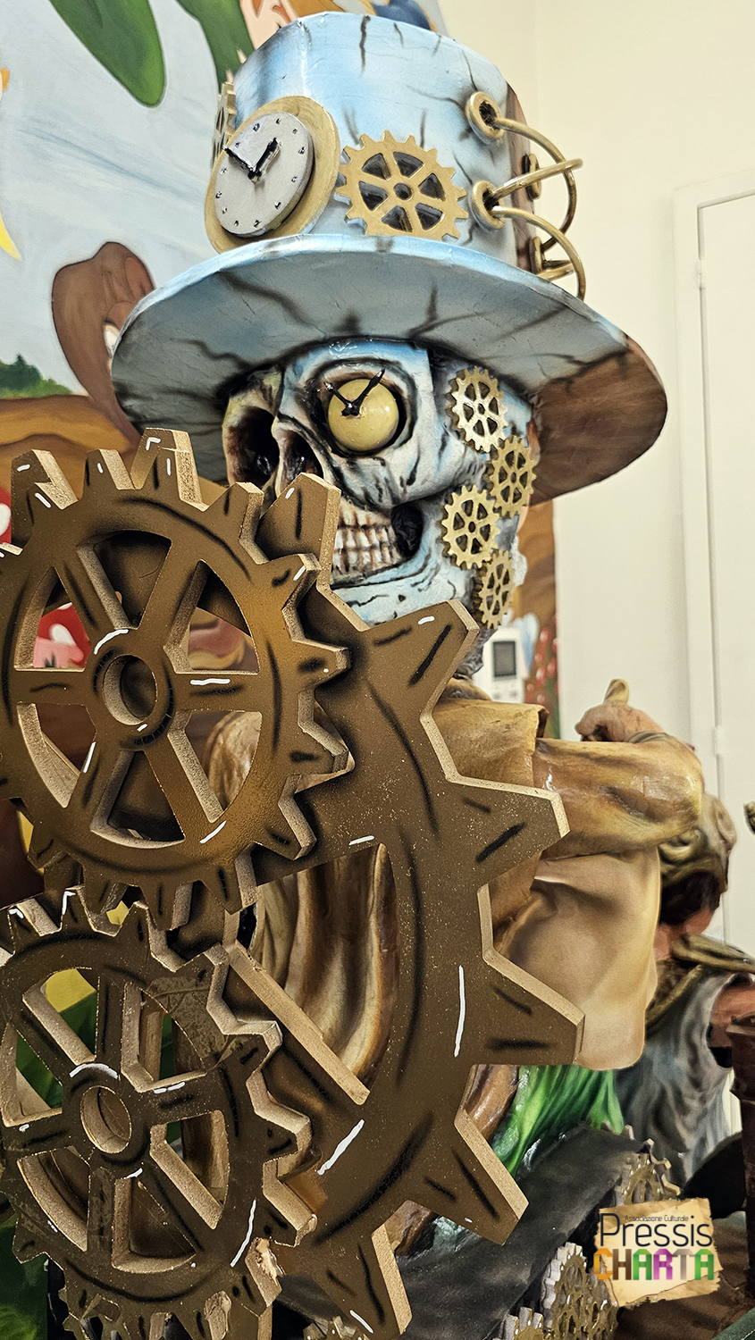 L’opera in cartapesta riproduce fedelmente forme, colori e movimenti del Carro Allegorico originale in scala.