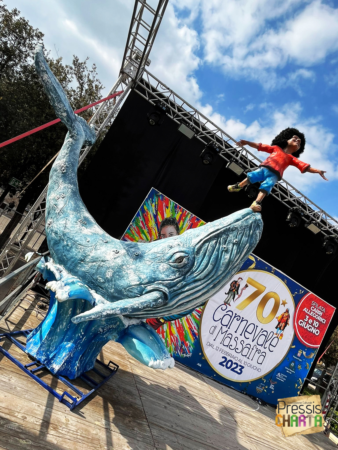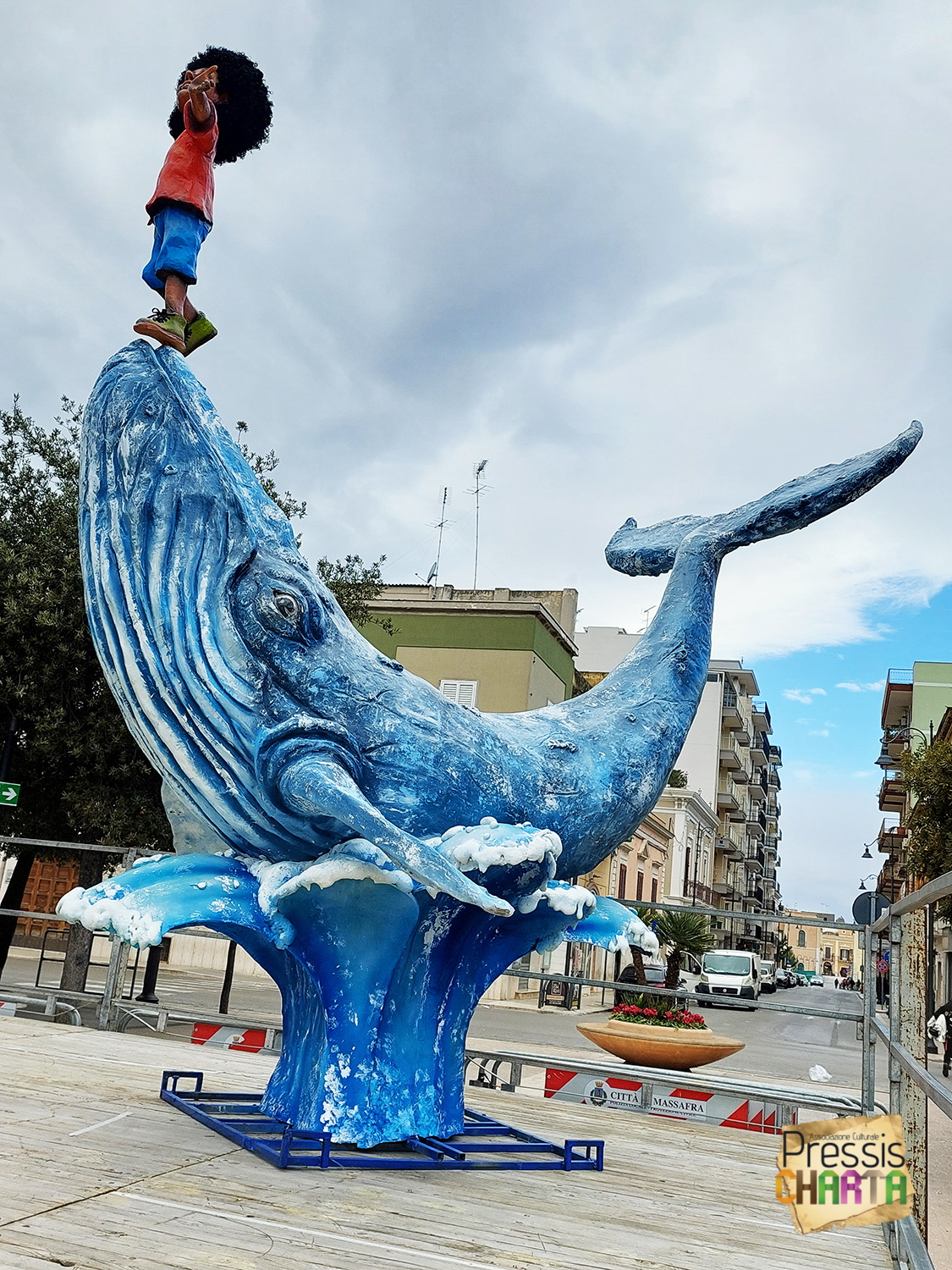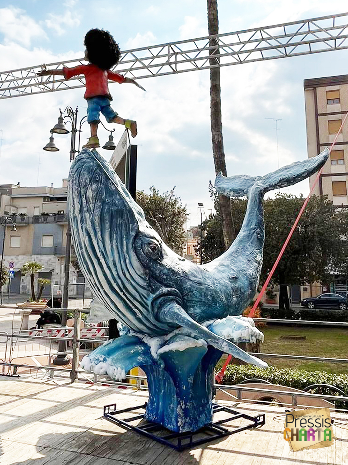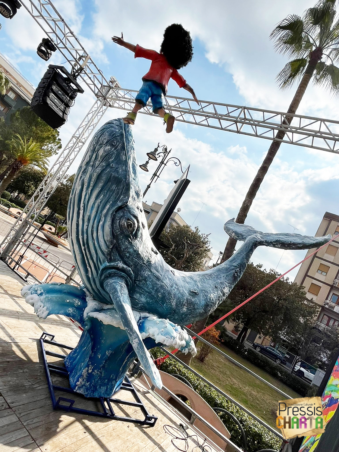 Il tema dell’opera in cartapesta tratta il Mare Nostrum, il mar Mediterraneo, ed è dedicato ai bambini messi in salvo dal mare e giunti a noi con nuove speranze, per ricordare la tragica scomparsa di Alan Kurdi il bimbo siriano ritrovato senza vita su una spiaggia della Turchia nel 2019, mentre, con la sua famiglia, tentava la traversata della speranza verso il sogno di una nuova esistenza. Nell’opera presentata è una balena a salvare un bambino dalle onde, che riprende simbolicamente antiche narrazioni ( la balena di Giona nel Vecchio Testamento fino a quella di Pinocchio), dove la maestosità dei cetacei e delle creature marine assume un valore protettivo e salvifico.