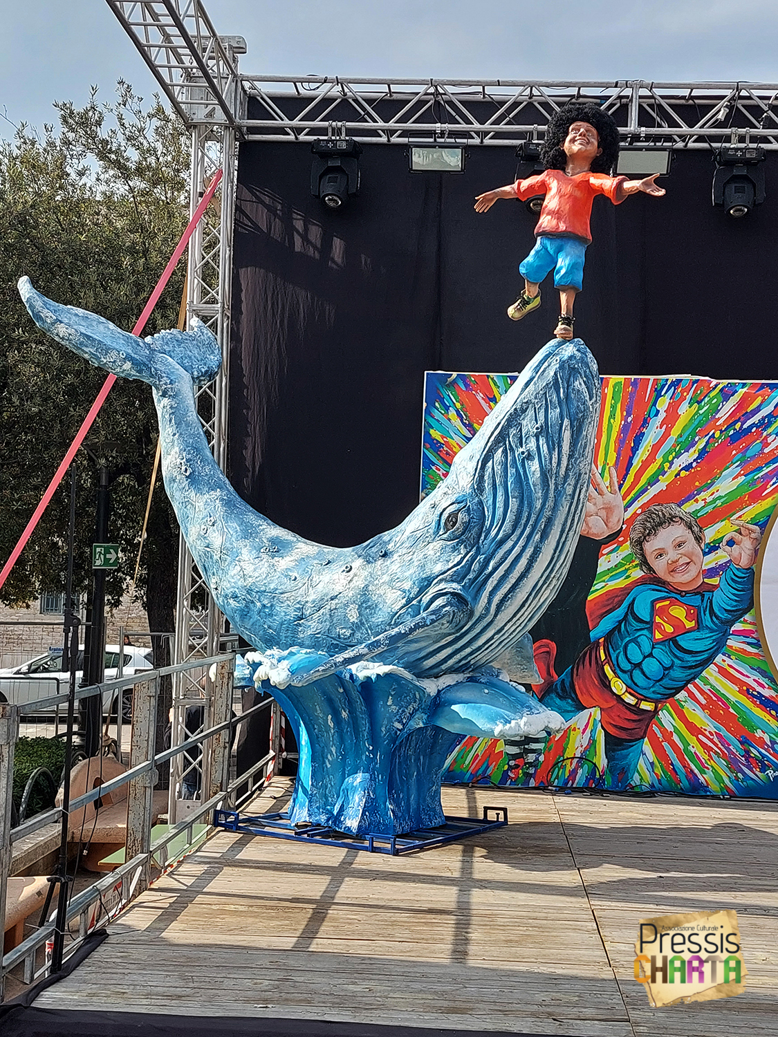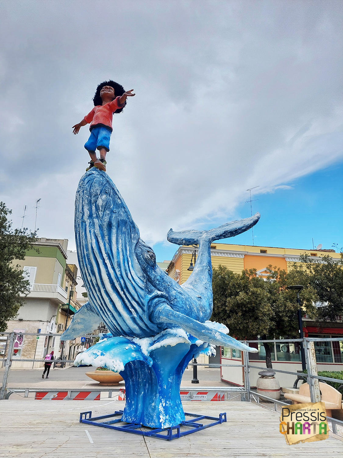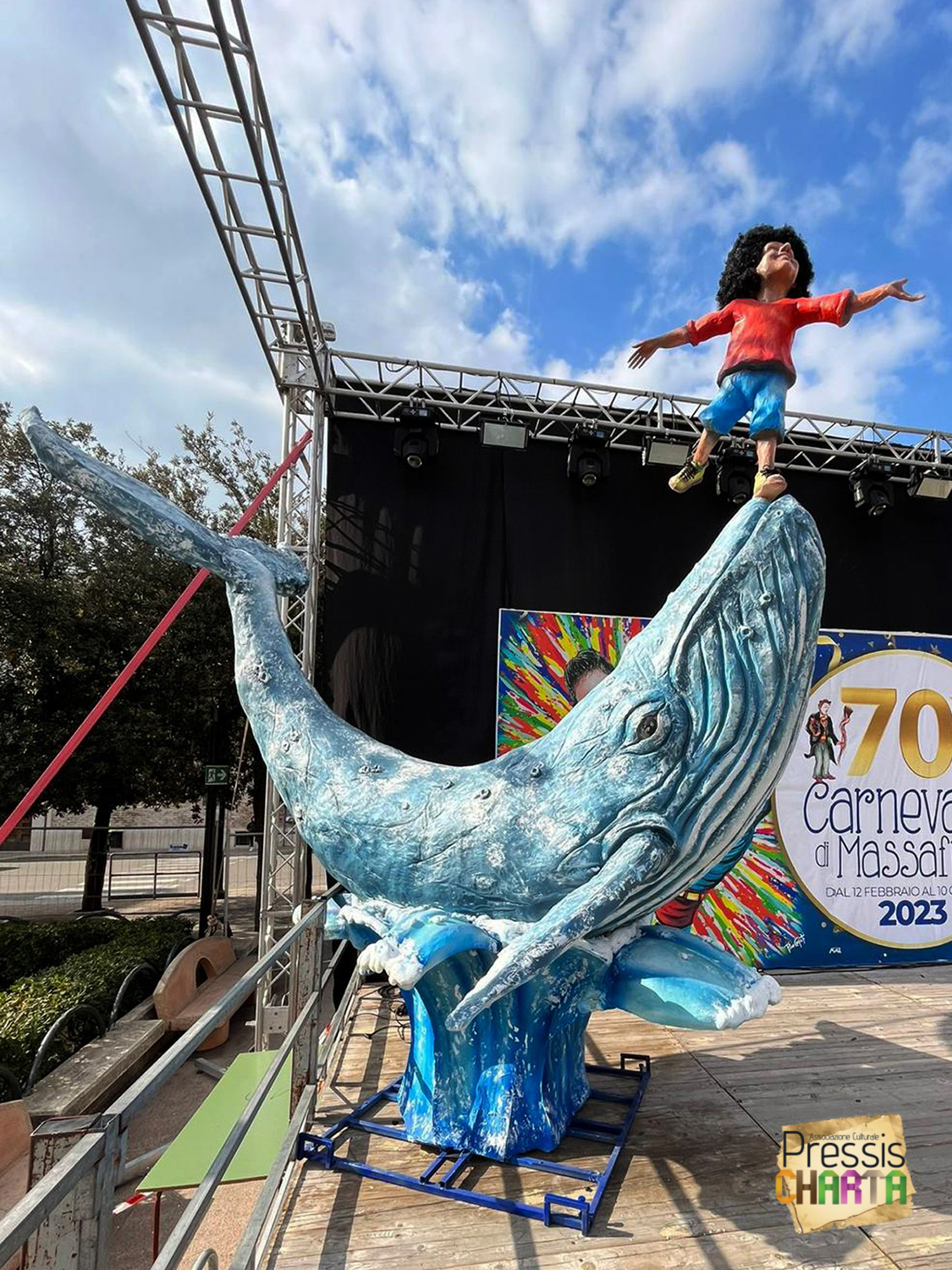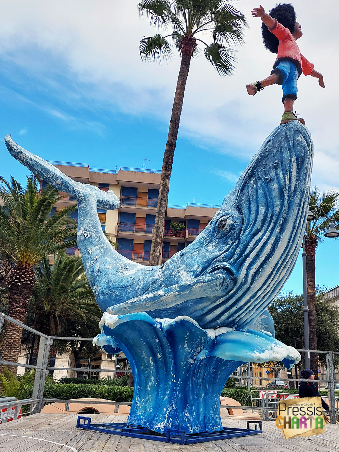 Il tema dell’opera in cartapesta tratta il Mare Nostrum, il mar Mediterraneo, ed è dedicato ai bambini messi in salvo dal mare e giunti a noi con nuove speranze, per ricordare la tragica scomparsa di Alan Kurdi il bimbo siriano ritrovato senza vita su una spiaggia della Turchia nel 2019, mentre, con la sua famiglia, tentava la traversata della speranza verso il sogno di una nuova esistenza. Nell’opera presentata è una balena a salvare un bambino dalle onde, che riprende simbolicamente antiche narrazioni ( la balena di Giona nel Vecchio Testamento fino a quella di Pinocchio), dove la maestosità dei cetacei e delle creature marine assume un valore protettivo e salvifico.