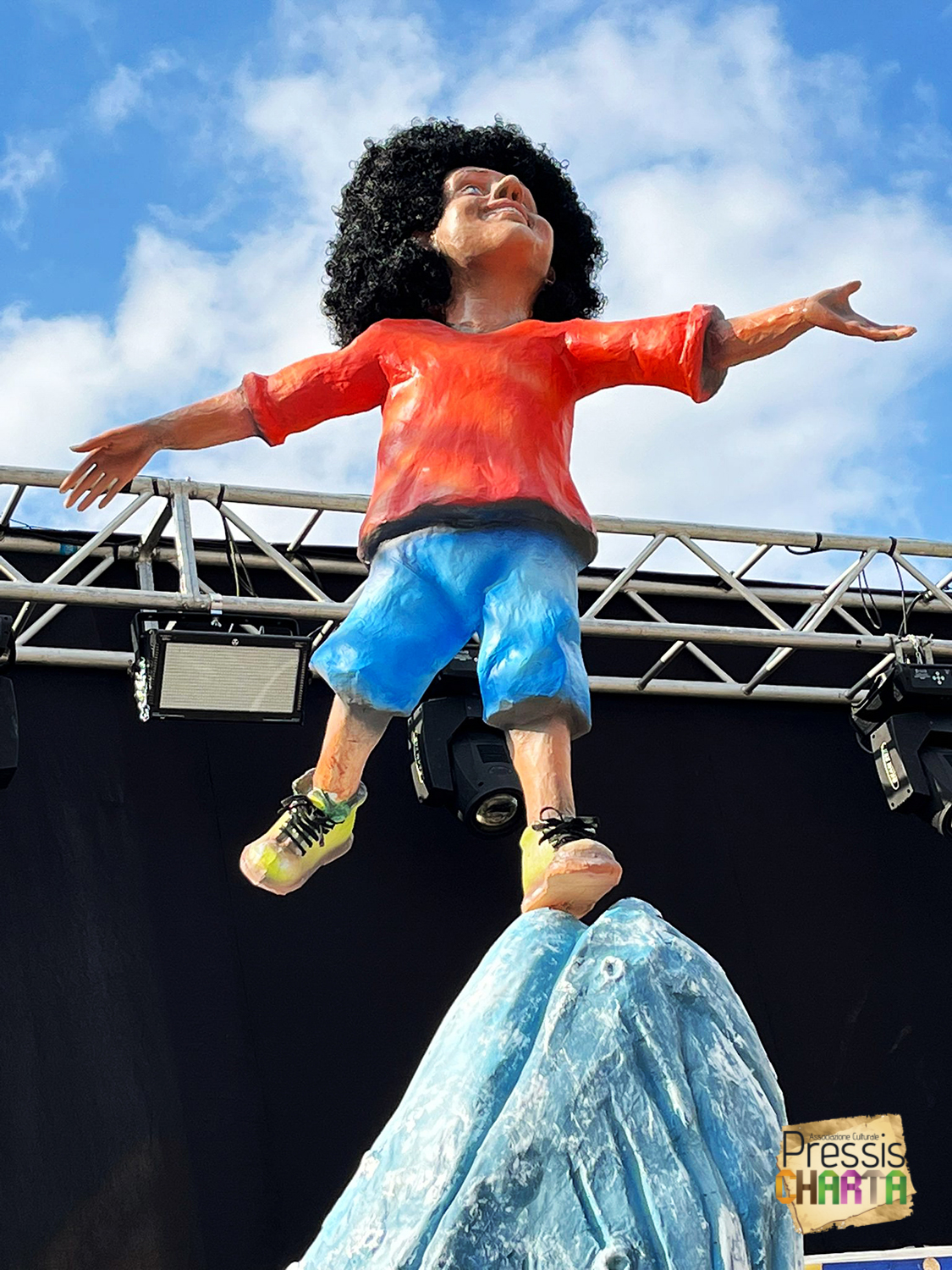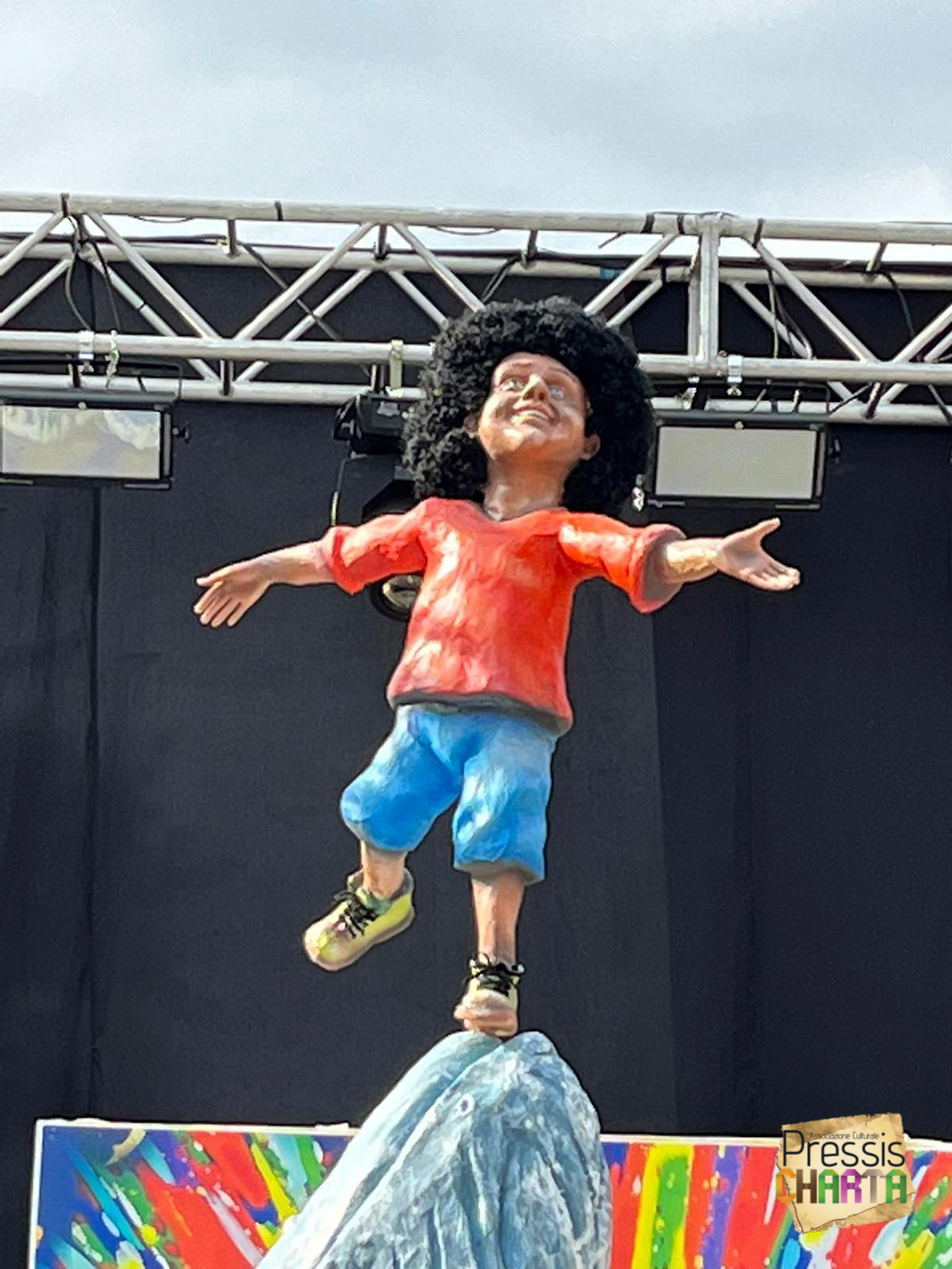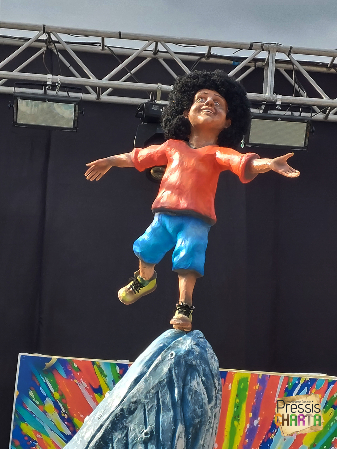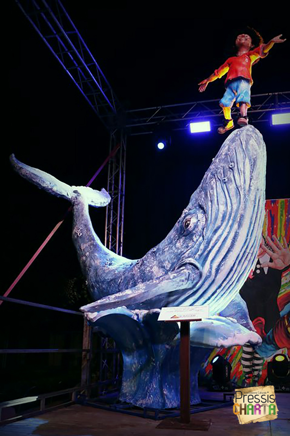 Il tema dell’opera in cartapesta tratta il Mare Nostrum, il mar Mediterraneo, ed è dedicato ai bambini messi in salvo dal mare e giunti a noi con nuove speranze, per ricordare la tragica scomparsa di Alan Kurdi il bimbo siriano ritrovato senza vita su una spiaggia della Turchia nel 2019, mentre, con la sua famiglia, tentava la traversata della speranza verso il sogno di una nuova esistenza. Nell’opera presentata è una balena a salvare un bambino dalle onde, che riprende simbolicamente antiche narrazioni ( la balena di Giona nel Vecchio Testamento fino a quella di Pinocchio), dove la maestosità dei cetacei e delle creature marine assume un valore protettivo e salvifico.